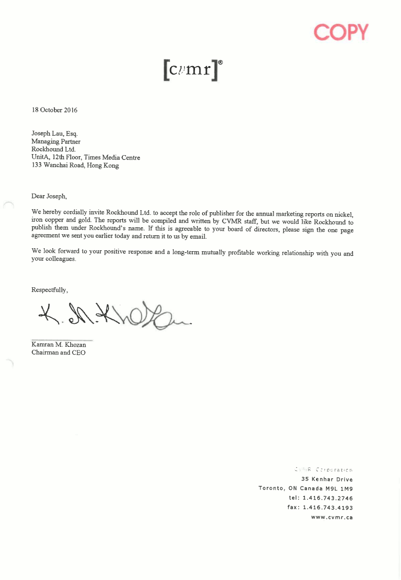 The Company also has working relationships with individuals who are specialist in particular areas and works. It also has a close working relationship with Chinese geological bureaus who have the capability of providing geological drilling, exploration services and resource modeling and have provided input to some Rockhound projects.